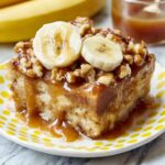 A rich and comforting Banana Bread Pudding featuring cubed French bread soaked in a creamy spiced custard with ripe bananas and walnuts, baked to golden perfection and topped with a luscious brown sugar butter sauce.