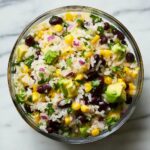 Dice the avocado to creamy chunks and finely chop the red onion and cilantro. Rinse and drain the black beans and corn; using canned corn or fresh off the cob ensures a sweet crunch. In a large salad bowl, combine all these fresh ingredients along with the cooled rice to build the hearty foundation of the salad.