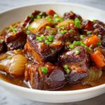 This Braised Oxtails Recipe is a rich, comforting dish featuring tender, fall-off-the-bone oxtails simmered low and slow in a flavorful broth of red wine, beef broth, aromatic vegetables, and seasonings. Perfect for a hearty main course inspired by Southern and Caribbean flavors, this dish pairs beautifully with mashed potatoes, rice, or grits and yields six generous servings.