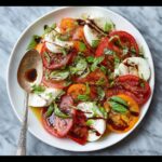A simple, fresh Caprese Salad featuring juicy heirloom tomatoes, creamy mozzarella, and fragrant basil, all enhanced by a sweet balsamic glaze and extra virgin olive oil. This classic Italian appetizer comes together in just 15 minutes and serves six, perfect for a light, refreshing starter or side dish.
