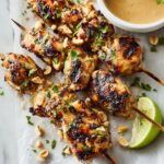 Arrange your chicken satay skewers on a platter, then sprinkle generously with chopped peanuts and fresh cilantro. The crunchy nuts and fragrant herbs add great texture and aroma that perfectly complement the rich peanut sauce served alongside. Don’t forget the lime wedges—squeezing fresh juice over the satay just before eating adds a zesty pop that lifts every bite.