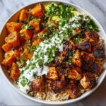Now for the fun part—layer your bowl starting with a bed of fluffy brown rice, followed by those crispy roasted sweet potatoes, and finally the golden chicken cubes. Drizzle generously with the garlicky yogurt sauce and get ready to dig into a bowl that’s as nutritious as it is delicious.
