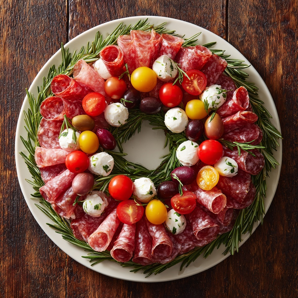 This Christmas Antipasto Wreath is a festive, colorful appetizer perfect for holiday parties. It combines marinated mozzarella balls, cherry tomatoes, a mix of olives, pepperoncini, salami, prosciutto, and artichoke hearts, arranged in a beautiful wreath shape garnished with fresh basil and rosemary. This no-cook Italian antipasto platter is easy to assemble, visually stunning, and delicious, making it ideal for sharing with guests.