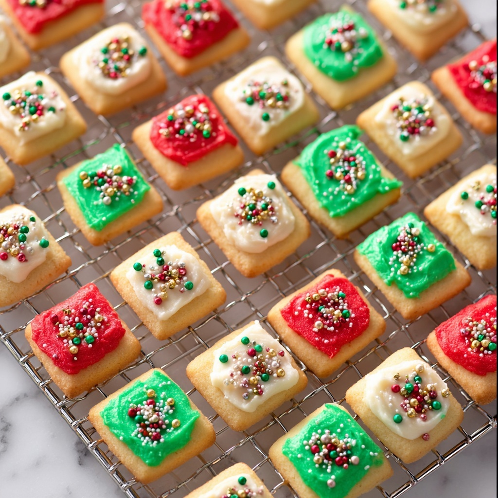 Christmas Sugar Cookie Bites are soft, buttery, and festive treats perfect for holiday celebrations. These bite-sized cookies are made with a simple dough enriched with cold butter, powdered sugar, and a hint of vanilla and almond extracts. After rolling and chilling, they are cut into small squares, baked to golden perfection, and decorated with colorful buttercream frosting and holiday sprinkles for a delightful seasonal treat.