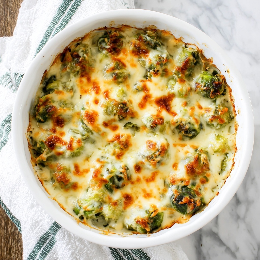 A rich and creamy Brussels sprouts bake featuring tender sautéed Brussels sprouts enveloped in a luscious blend of heavy cream and melted cheeses, baked until bubbly and golden brown. This comforting side dish combines savory garlic, buttery undertones, and a crispy cheese topping, perfect for holiday dinners or cozy family meals.