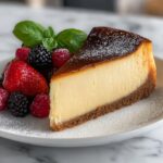The “burnt” in this cheesecake refers to its deeply caramelized top, created by baking at high heat until the surface turns a rich golden brown with slightly darker spots. This contrast adds a smoky sweetness and unique flavor that balances the creamy inside.