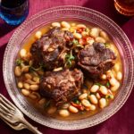 This recipe features crispy oven-roasted chicken thighs served over a tangy and flavorful white bean stew with vinegar and mustard, perfect for a hearty and satisfying weeknight dinner.