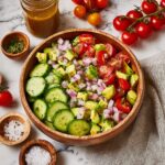 Start by thinly slicing your cucumber into half-moons and halving the cherry tomatoes to release their juicy sweetness. Cube the avocado carefully to maintain its shape and finely chop the red onion. Toss all these fresh ingredients into a large serving bowl to lay the perfect foundation for your salad.