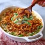 Once the casserole is baked, remove it from the oven. Sprinkle the remaining crispy fried onions evenly on top for that signature golden crunch. Return it to the oven for an additional 5 to 10 minutes, or until the onions are perfectly toasted and the casserole is irresistibly bubbly.