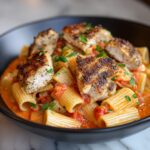 Remove your beautifully glazed chicken from the skillet and let it rest for a couple of minutes. Resting helps the juices redistribute inside, ensuring every bite is tender and juicy. Then slice the chicken into strips, ready to crown your pasta masterpiece.