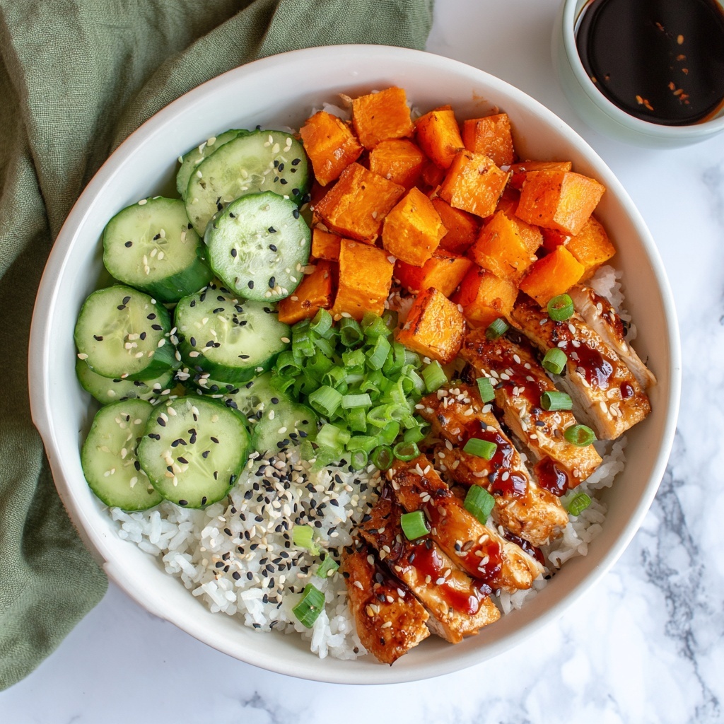 This Hot Honey Chicken Bowl recipe offers a vibrant and balanced meal with roasted chicken thighs and sweet potatoes, paired with quick pickled cucumbers, creamy avocado, and a sweet-spicy hot honey drizzle over fluffy white rice. Perfect for an easy yet flavorful dinner in under an hour.