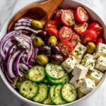 The classic recipe includes feta cheese, which is not vegan, but you can easily swap it for a vegan cheese alternative or simply omit it to keep the salad plant-based and delicious.