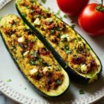 This Mediterranean Stuffed Zucchini recipe features tender zucchini boats filled with a flavorful mixture of feta cheese, cherry tomatoes, kalamata olives, fresh herbs, and aromatic spices. Baked to perfection with a crispy breadcrumb topping and a bright touch of lemon, this dish offers a delightful balance of fresh, tangy, and savory Mediterranean flavors. Perfect as a light main course or a delicious side dish for any meal.