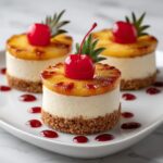 - Add the Pineapple Topping: Once the mini cheesecakes are chilled, carefully spoon the cooled pineapple topping over each cheesecake. Add a maraschino cherry on top of each for a decorative and festive touch if desired.
