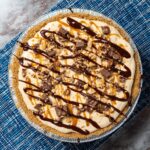- Add Toppings and Serve: When ready to serve, drizzle the top of the pie with chocolate sauce and the remaining caramel sauce. Sprinkle chopped dry roasted peanuts and chopped Snickers bars over the top. Add a dollop of whipped cream if desired for extra creaminess and presentation.