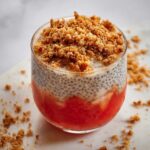 - Assemble and Serve: Spoon a portion of the chilled chia pudding into serving glasses or bowls. Pinch portions of the crumble together to form bigger clumps and generously sprinkle over the pudding. Enjoy this peach cobbler-inspired chia pudding as a nutritious and flavorful meal or snack.