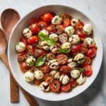 Serve it in individual glass bowls to show off its colorful layers or try skewering grape tomatoes, bocconcini, and basil leaves on toothpicks, drizzled with pesto and balsamic glaze for a fun appetizer twist. Either way, the presentation will match the salad’s fresh and festive personality.