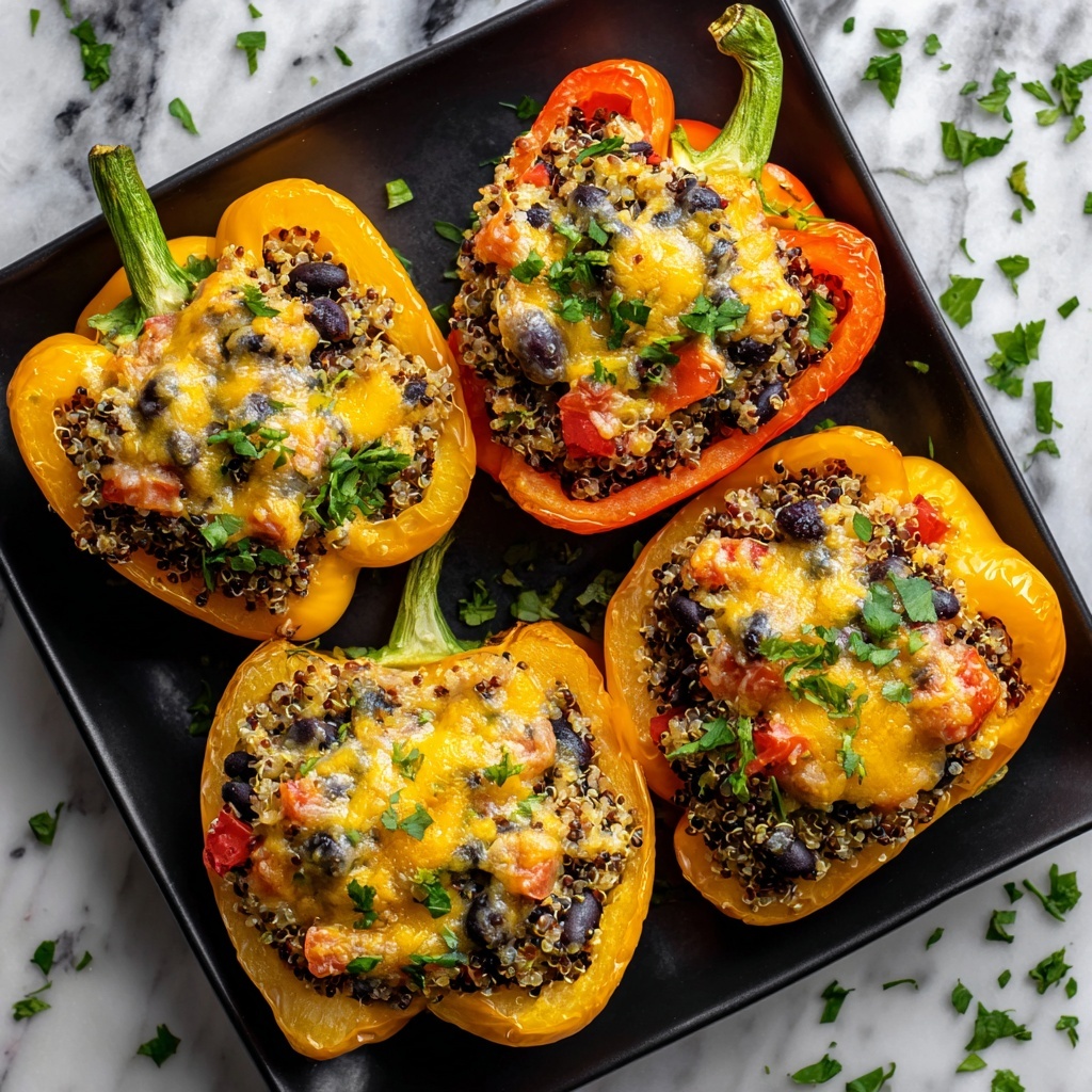 These Quinoa and Black Bean Stuffed Peppers are a hearty and nutritious vegetarian dish perfect for a wholesome dinner. Colorful bell peppers are filled with a flavorful mixture of quinoa, black beans, corn, tomatoes, and spices, then baked to perfection and topped with melted cheese and fresh cilantro for a delicious, satisfying meal.