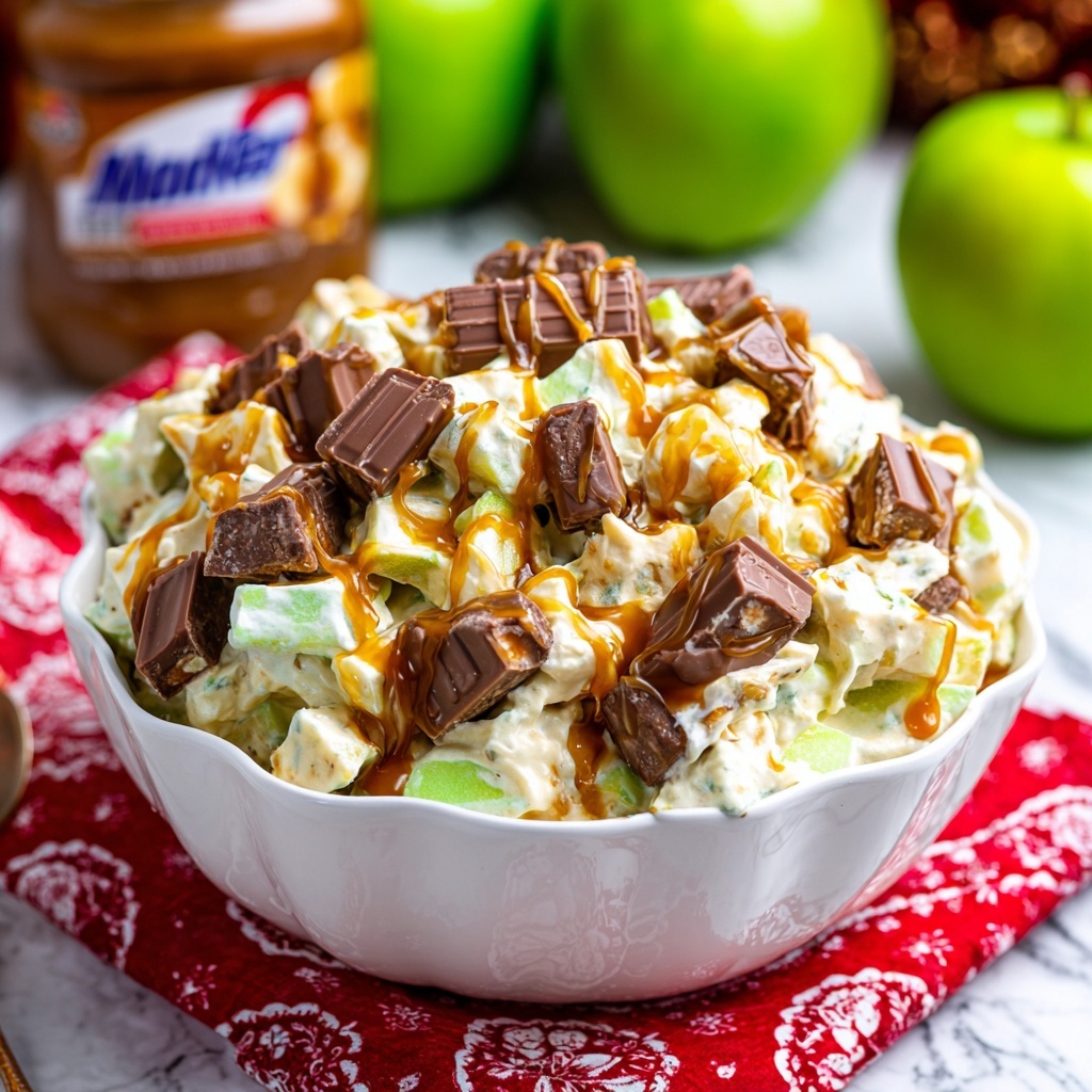 To amp up the look and flavor, consider topping the salad with a sprinkle of chopped peanuts or extra Snickers pieces right before serving. A little sea salt on top can enhance the caramel’s sweetness beautifully, too.