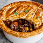 A classic British steak and onion pie featuring tender stewing beef cooked with onions, garlic, and flavorful herbs, all encased in a flaky puff pastry crust. Perfect as a comforting main course, this recipe balances a rich, savory filling with golden, crisp pastry.