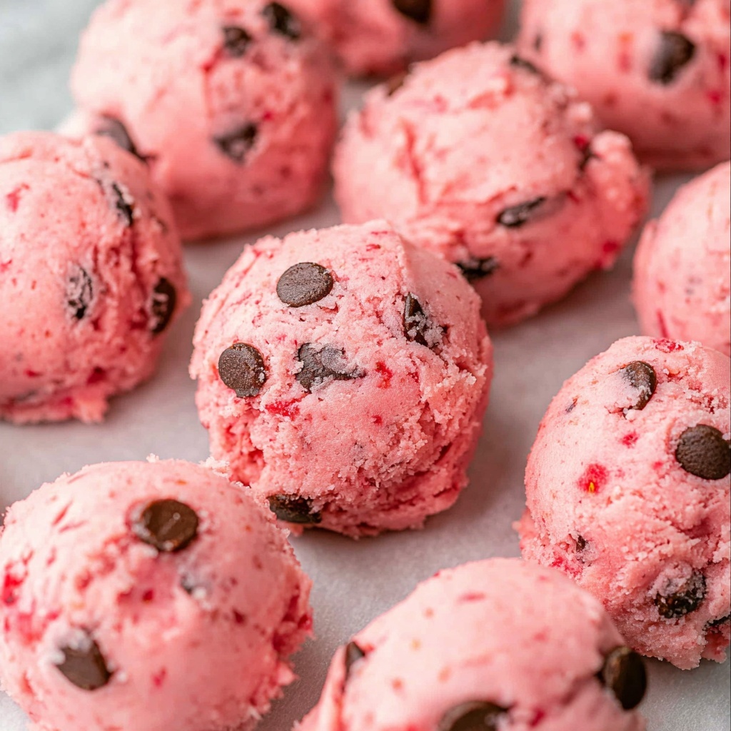 In a large bowl, combine the sugar cookie mix, softened butter, strawberry extract, pink food coloring, and egg. Mix everything until a soft dough comes together. This is where the magic begins—seeing the dough take on a gentle pink hue hints at the delicious strawberry flavor to come. Then, fold in the mini chocolate chips and crushed freeze-dried strawberries, evenly distributing those irresistible bursts of cocoa and fruity crunch.