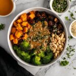 In a bowl, whisk together creamy peanut butter, soy sauce (or tamari), lime juice, maple syrup or honey, minced garlic, and grated ginger until smooth. Add water gradually to adjust the consistency until it’s silky and easily drizzleable. For a spicy twist, stir in half a teaspoon of red chili flakes. This sauce is what ties the entire bowl together with bold flavors and that signature creamy texture.