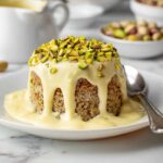 Before serving, whip the chilled coconut cream together with pistachio butter until smooth and fluffy. Spread this luscious topping over the soaked cake and finish with a generous sprinkle of chopped pistachios for crunch and that gorgeous green pop of color.